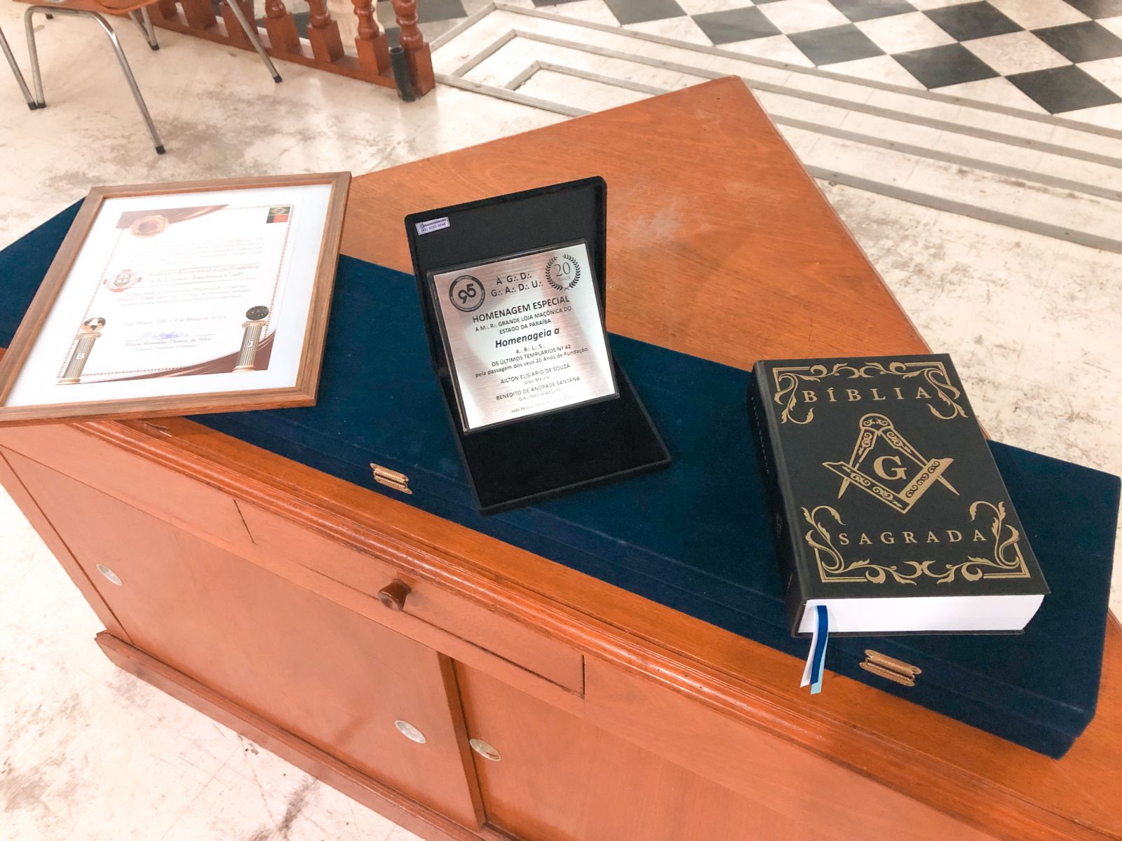Na sequência, o Venerável Mestre Clidenor Jr. recebeu alguns mimos pela loja: Placa de homenagem enviada pela G.·.L.·.E.·.P.·.B.·. e entregue pelo G.·. M.·. Ailton e G.·. M.·. ADJ.·. Benedito, Placa de parabéns enviada pela 2ª Inspetoria Litúrgica, entregue pelo Ir.·. Nilson Fernandes (Grande Inspetor Litúrgico) e Livro da Lei, presente do Ir.·. Alexandre Mariano (Obreiro da Loja e Grande Mestre de Harmonia GLEPB).